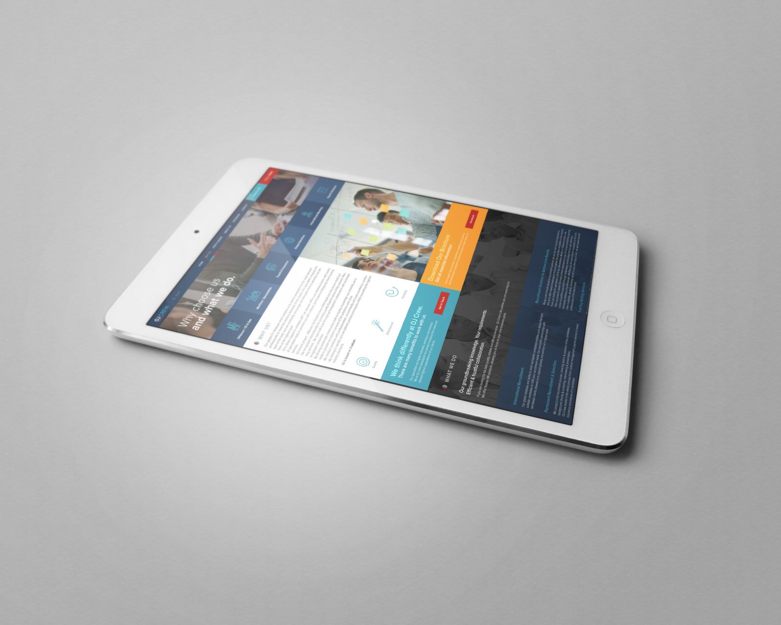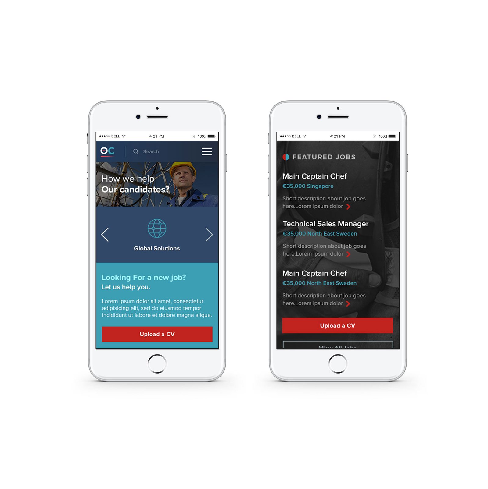 Scrolling through the landing and inner pages, we implemented strong call to action buttons that stick out from the rest of the designs. These call to actions mainly provoke two actions - FIND A CREW or UPLOAD A CV. Short preview of available jobs had significant impact on conversions from the landing page. And showing some strong facts about company improved trust and liability of OJCREW for its potential future clients.
