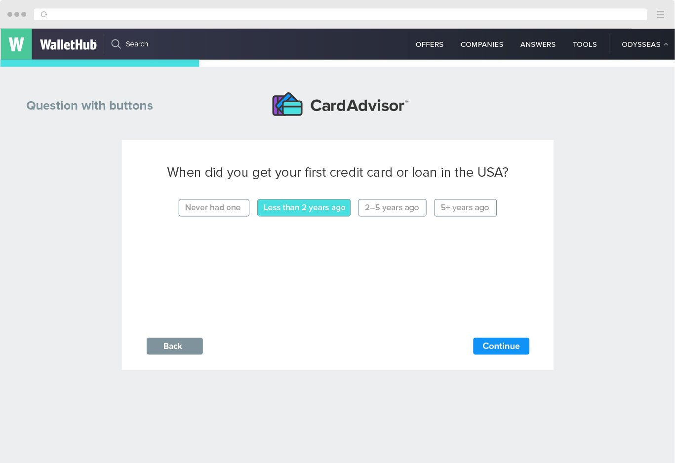 The product designer and I decided to go with simple steps- questions, where users enter their information and as a result get the best deal on credit card specifically for them. Instead of filling out long forms about the customer’s needs and current financial situation, questions on user’s experience seemed like a better idea.