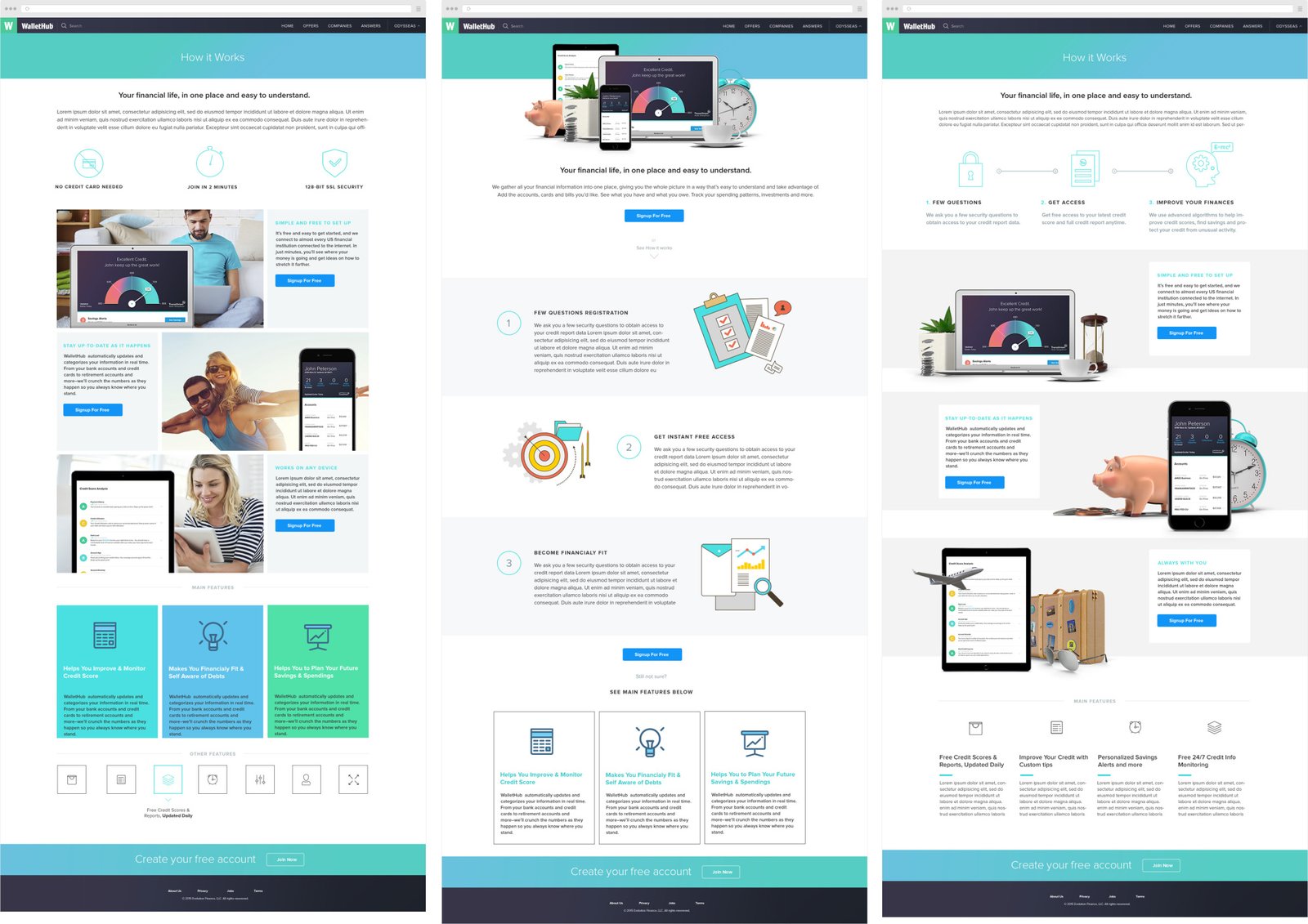 Existing landing page can be found here, at www.wallethub.com. However, during the time I was working for WalletHub I noticed that existing landing page had some issues with its’ user experience. I strongly believed that it could acquire better conversions for call to actions, and for overall better look. I was asked to do my own version of landing page, which would be implemented sometime next year. There are few different versions, please check below.