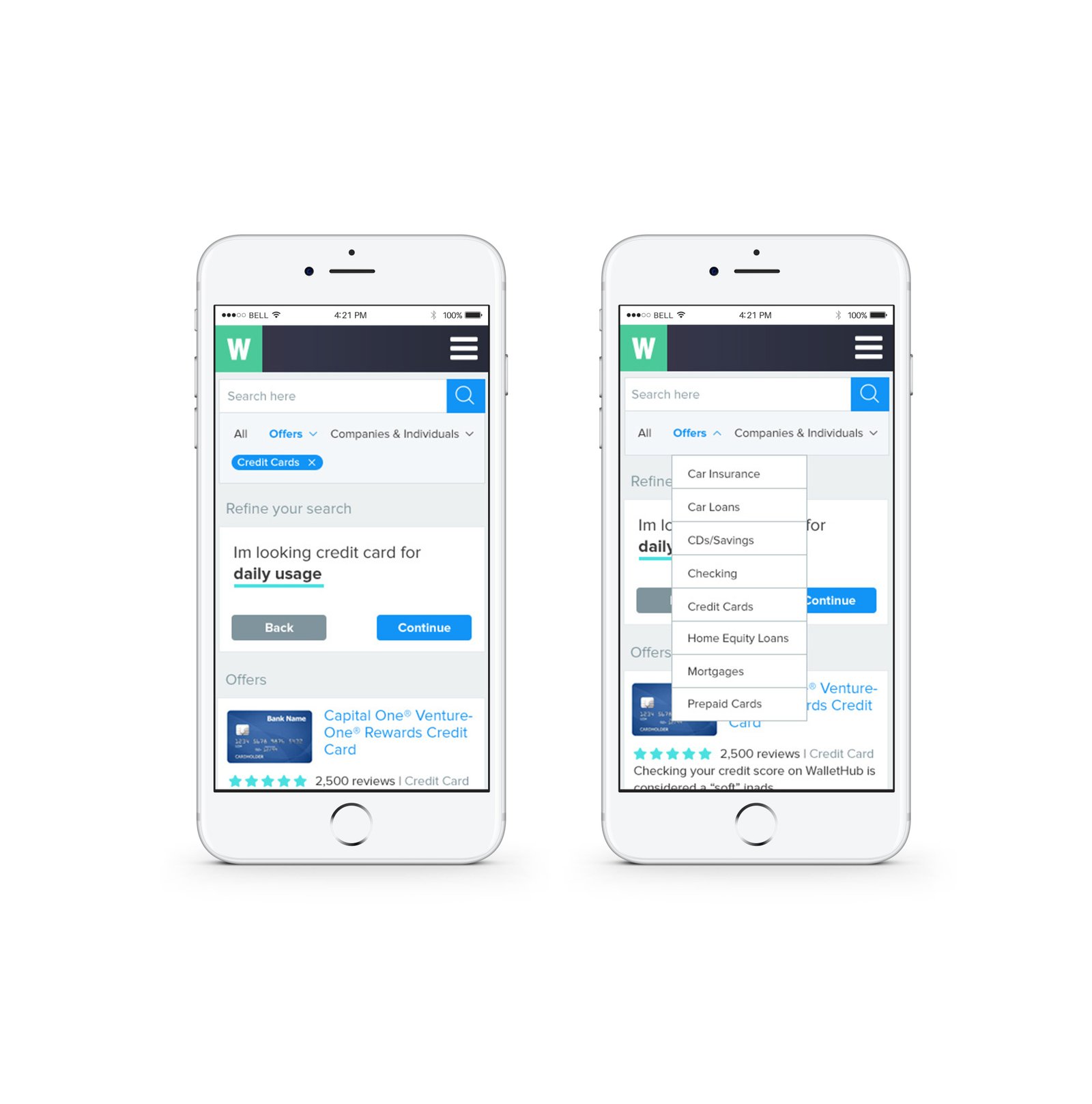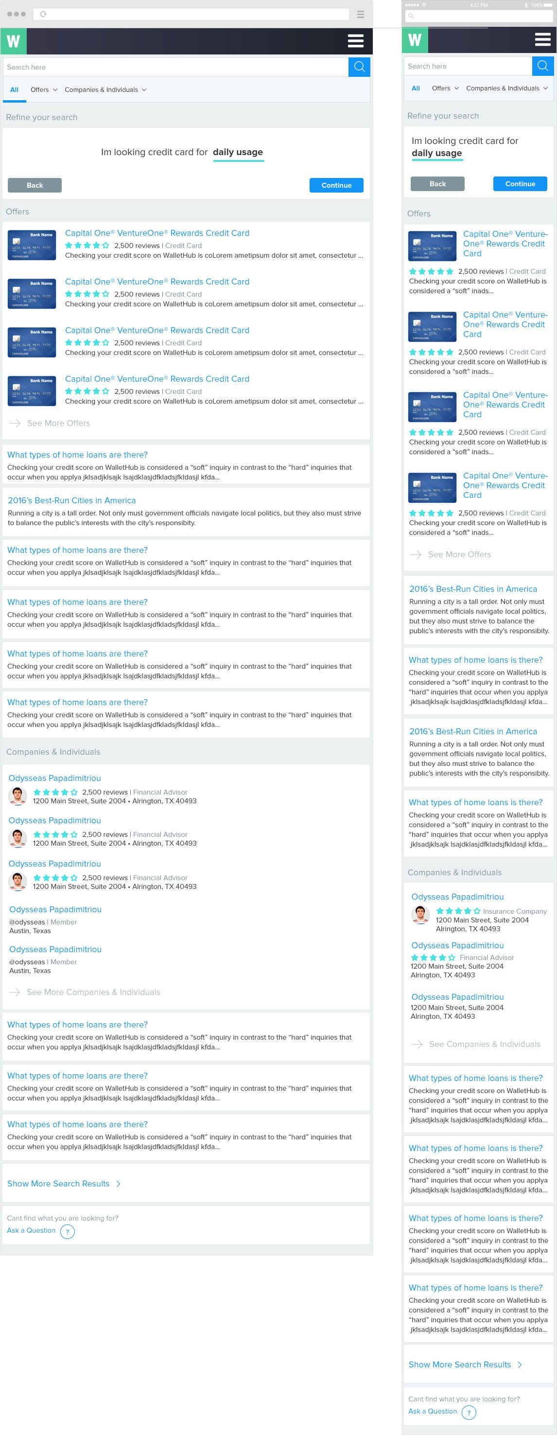 My main focus and goal was to send a straightforward message as to what WalletHub is about. Also, to decrease the height of the header, and to show CREDIT CARD CATEGORIES without too much scrolling through the page show. Credit card search tool is the main revenue source for this product, so showing the credit cards at the top and under the header was a sensible and efficient decision. Instead of showing the header image with illustration of a couple (that resembles a dating app), I decided to go with a product screenshot and showcase them in different devices.