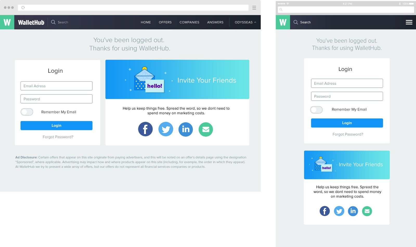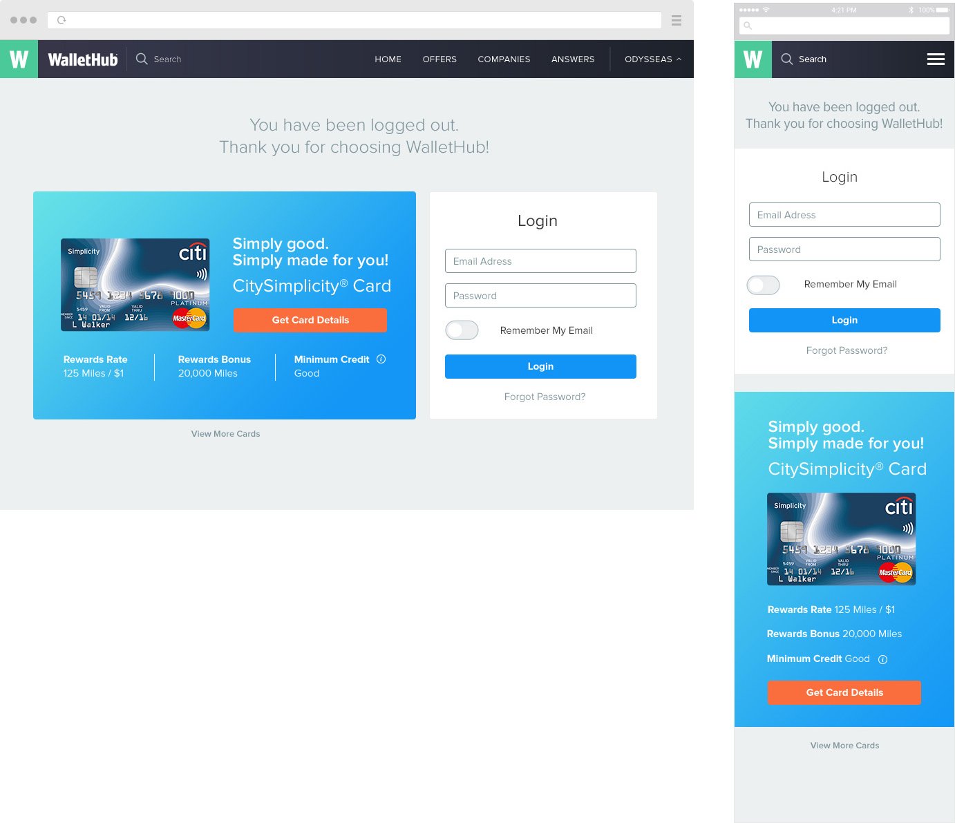 I was asked to design a page which people will get after they sign-out from WalletHub website. Company's goal was that this page should have some value for people, so I offered ideas of showing AD of our mobile application or offering for user a special credit card offer that suits their needs. Below you can see some results of my work.